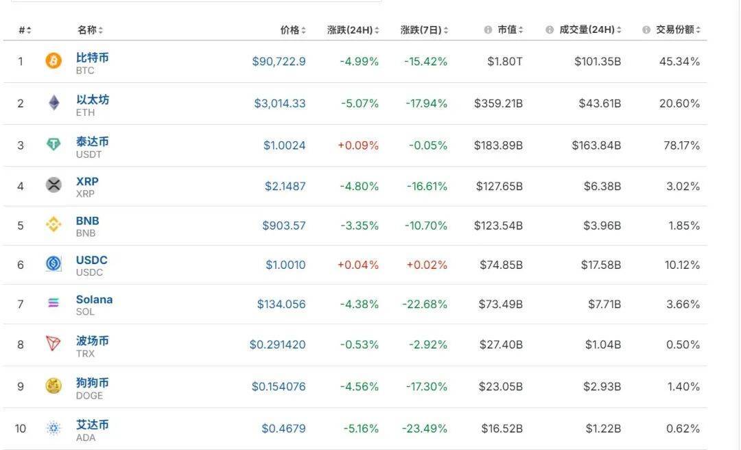截至发稿,比特币报90722.9美元,跌幅4.99%。以太坊、艾达币跌超5%,狗狗币跌4.56%。