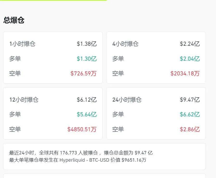 据Coinglass数据显示,24小时内,全网共有176721人被爆仓,爆仓总金额为9.47亿美元(约合人民币67亿元)。