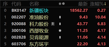 今日,准油股份上涨10.04%,报收9.43元;科力股份上涨6.83%,报收43.77元;西部牧业上涨4.17%,报收11.25元;贝肯能源上涨4.14%,报收11.06元;东方环宇上涨4.13%,报收22.20元。天顺股份、德新科技、*ST天山、中泰化学、渤海租赁跌幅居前。