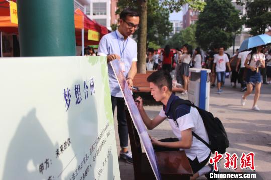 中新网南京9月3日电 (记者 崔佳明)“甲方:未来的你;乙方:现在的你。甲方因未来生活工作的需要,使得乙方能够在大学四年期间成为一个有梦想有目标追求卓越的人,在平等自愿的基础上,同意签订本梦想合同。”3日,扬州大学法学院新生报到处的这样一份别致的合同,引起了前来报到的新生与家长们的注意。