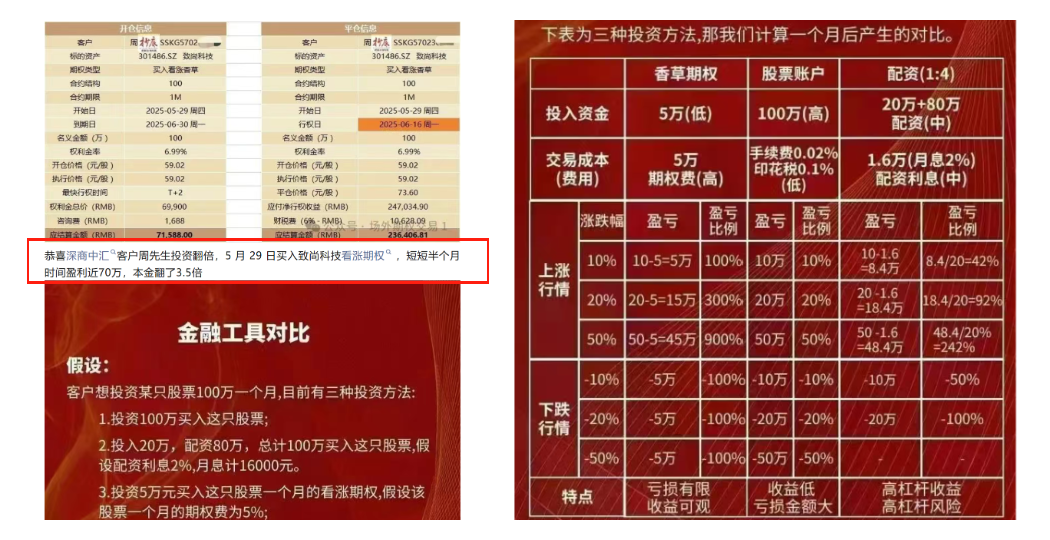 按深商中汇的宣传包装,投资者有时仅需支付5万本金(期权费)便可买到名义本金(股票市值)100万元的个股收益权,杠杆效果高达20倍。假设标的个股月内上涨50%,投资者盈利便可达到100万✖50%-5万=45万元;若标的个股到期下跌,投资者损失仅5万元期权费用。
